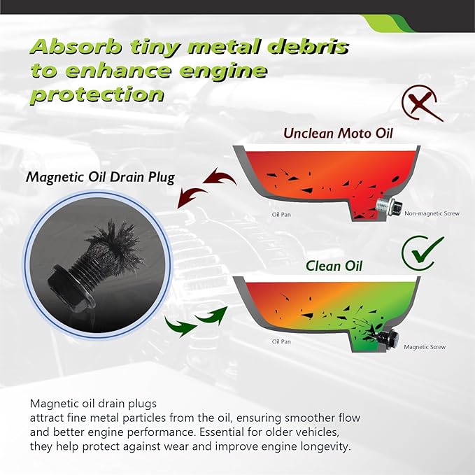 - Upgraded Magnetic Drain Plug for Engine Safety The M12 x1.25 magnetic drain plug is equipped with a strong magnet that captures harmful metal particles, preventing them from circulating in your engine. This extra layer of protection helps reduce engine wear and lowers the risk of costly repairs, giving you peace of mind every time you drive.