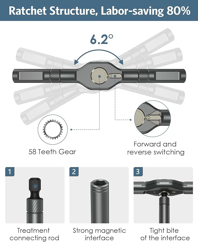 - Effortless Ratcheting Mechanism:Equipped with a precision 58-tooth gear system and 6.2° fine ratchet angle — saves up to 80% effort. With a max torque of 50N·m / 50KG, it allows smooth forward/reverse switching without wrist strain. Perfect for fast, efficient work