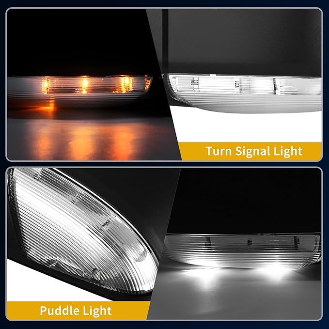 - Advanced Functionality: Power-adjustable plane mirror for customized visibility. Power heated plane mirror ensure clarity in cold weather. With led turn signal, puddle light, and manual folding, this side mirrors provides you with wider view