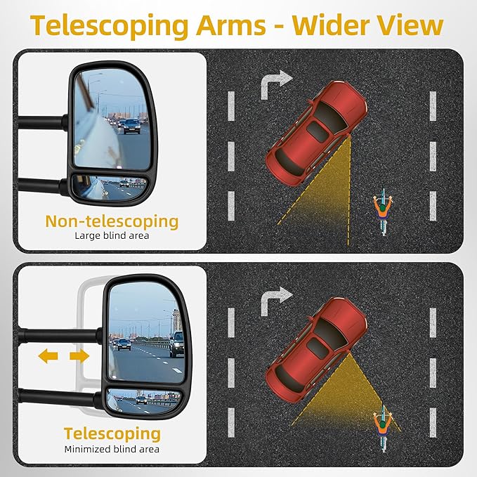 - Mirror Dimensions: Includes a pair of telescoping trailer tow mirrors for both driver and passenger sides.. side mirror length is 14.1” (closed) and 11” (extended); side mirror size is 12”×8.2”