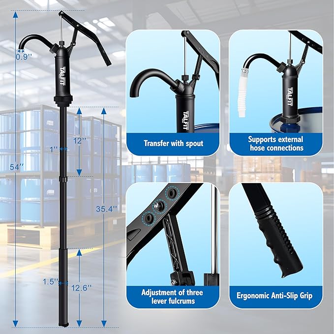- ✔️Lever - Operated Drum Pump:The handle of this 55 gallon drum pump is ergonomically designed, providing a secure and comfortable grip. This allows you to exert greater pressure with minimal effort.
