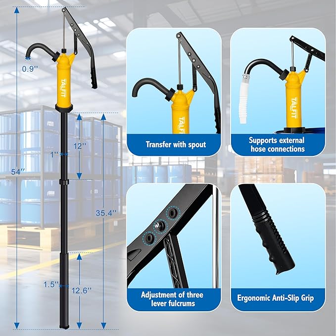 - ✔️Lever - Operated Drum Pump:The handle of this 55 gallon drum pump is ergonomically designed, providing a secure and comfortable grip. This allows you to exert greater pressure with minimal effort.