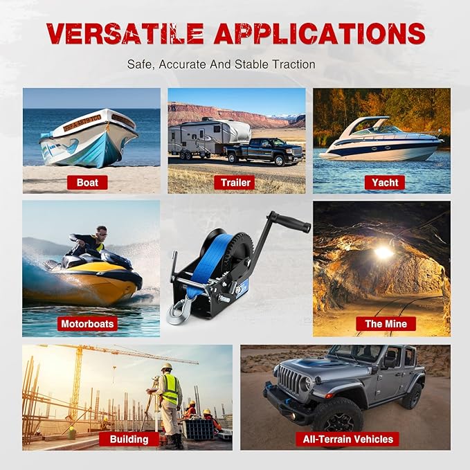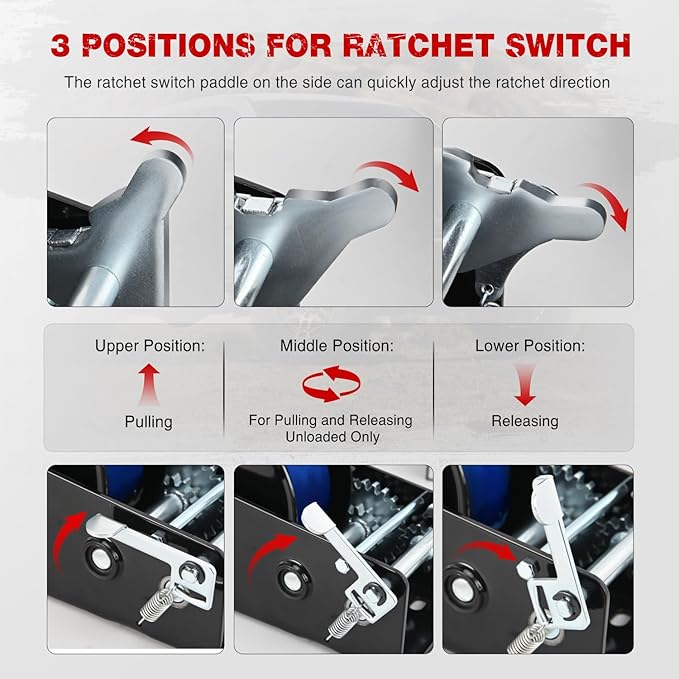 - TWO-WAY RATCHET WINCH: The boat crank winches feature a top-notch carbon steel two way ratchet that ratchets forward and backward to provide you with operational flexibility. The two speed 4:1 and 8:1 gear ratios give you more options and faster ultra-easy towing. Making it the perfect outdoor boat trailer towing tool