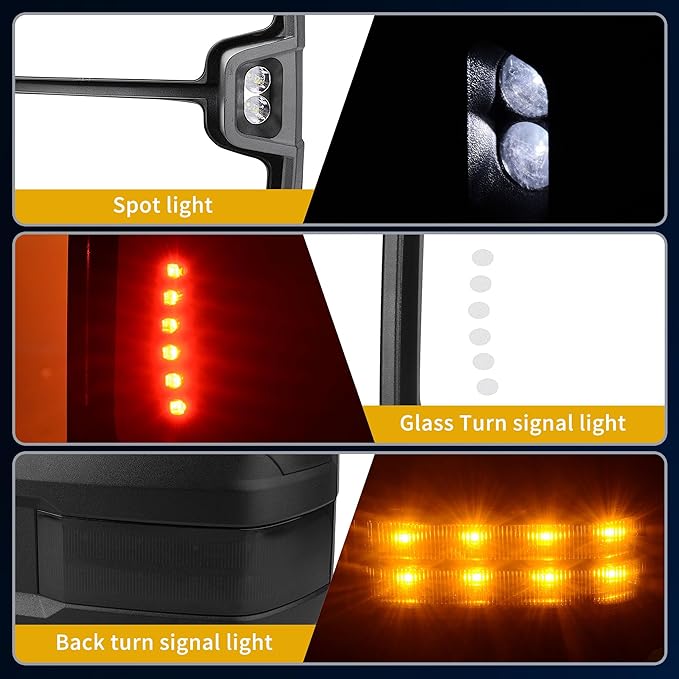 - Functions: featuring power adjustable & power heated plane mirror, led signal lights & arrow lights, manually adjustable convex lens, clearance light, the multifunctional side mirrors can strikingly enhance your driving experience, manual telescoping & manual folding