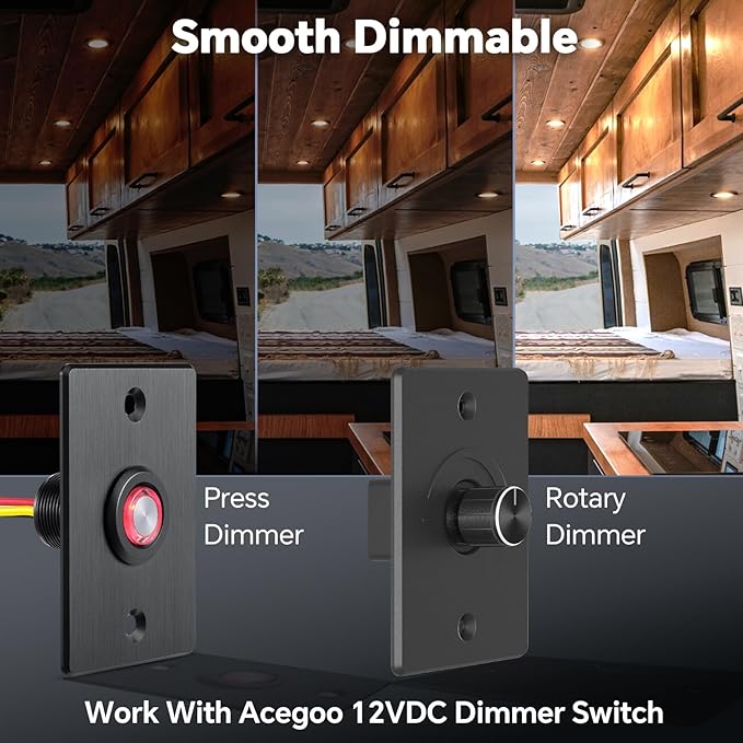 - 0-100% Smooth Dimmable: The RV Puck Lights are compatible with Acegoo's 12V dimmer switch to create 0-100% stepless dimming lighting and save battery power. The dimmer switch (integrated with on/off and dimming control) is sold separately