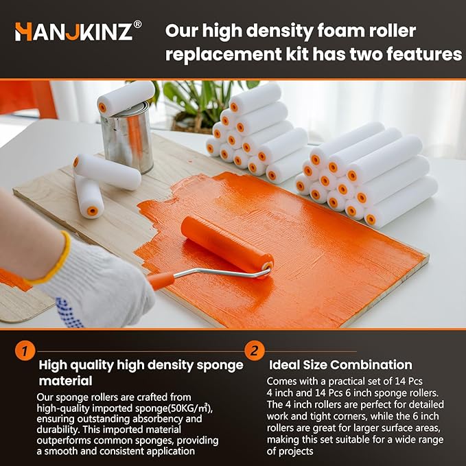 - Abundant Quantity & Perfect Size Combination: Get a total of 28pcs foam paint rollers, with 14 pieces of 4 inch high density paint rollers and 14 pieces of 6 inch high density sponge rollers. The 4 inch rollers are great for detailed work like corners and edges, while the 6 inch ones are ideal for larger, flat surfaces, meeting all your painting needs
