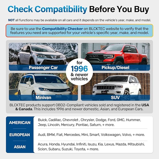 - [Free Lifetime Update, Unmatched Vehicle Compatibility] - The BLCKTEC 460T comes with free lifetime updates, ensuring your scanner always has the latest diagnostic technology and supports new vehicle models. The 460T is compatible with all OBD2-compliant vehicles sold and registered in the USA and Canada from 1996 onward. This includes passenger cars, minivans, SUVs, pickups, light-duty trucks, and diesel vehicles manufactured by domestic, Asian, and European automakers.