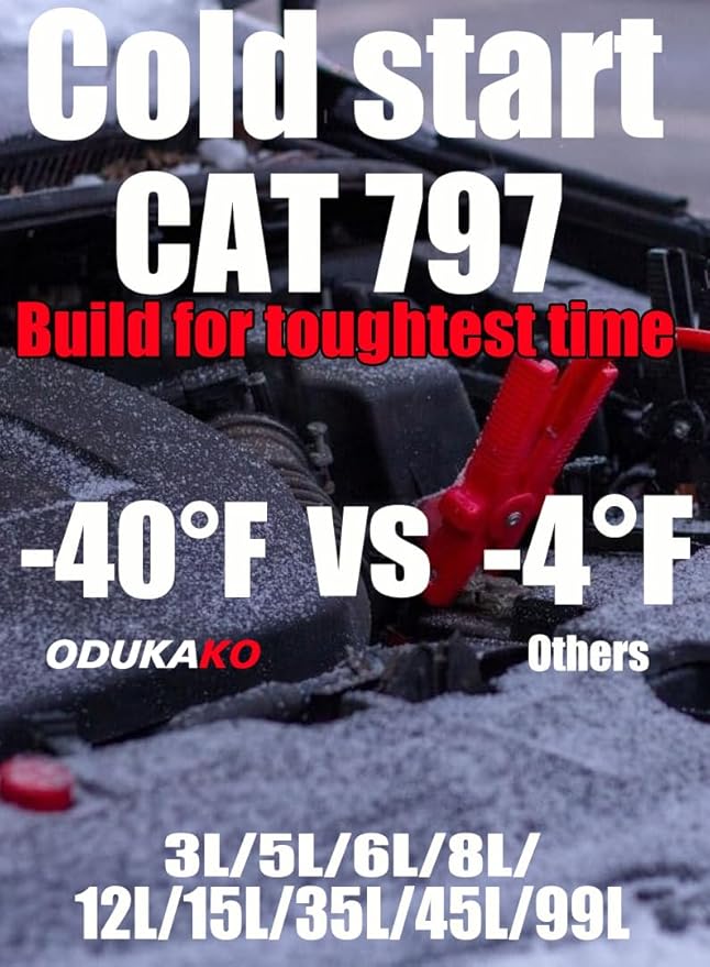 - POWERFUL ENOUGH FOR SEMI TRUCKS & HEAVY EQUIPMENT—Odukako CAT797 boost unleashes a massive 30,000A peak current and a robust 1500A,(24V) / 3,000A(12V) Cold Cranking Amps (CCA) to reliably start diesel engines up to 50 liters and massive gasoline engines up to 99 liters (V12/V24). Conquers dead batteries in peterbilt/ ken worth Semis/komatsu/caterpillar,Crane,Mining Truck,Dump Truck,Haul,Excavators, Large Yachts,Tractors,and Heavy-Duty Generators.