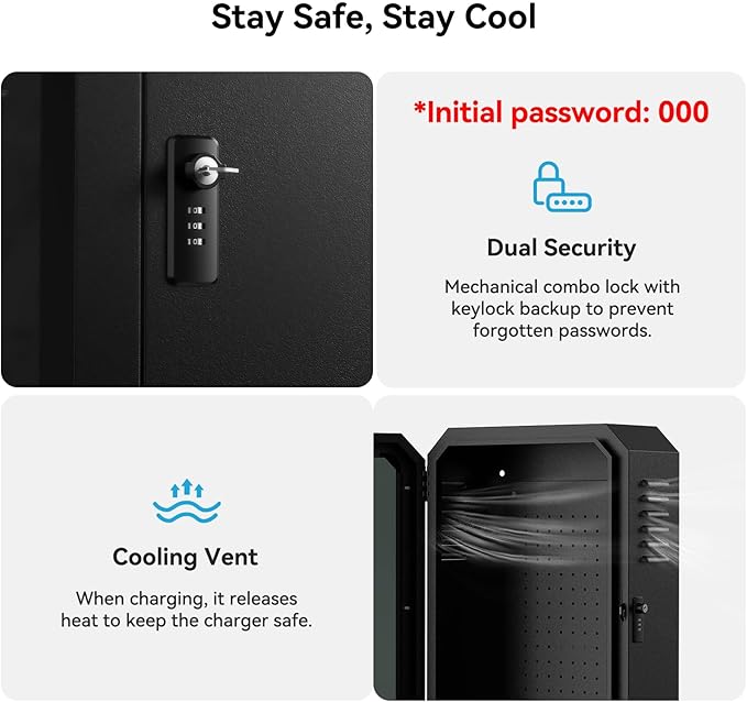 - 【Dual Protection】This charger lock box features a high-stability mechanical combination lock with key-based combination reset and dual-directional ventilation, ensuring safe and secure charging with efficient heat dissipation while offering long-term reliability