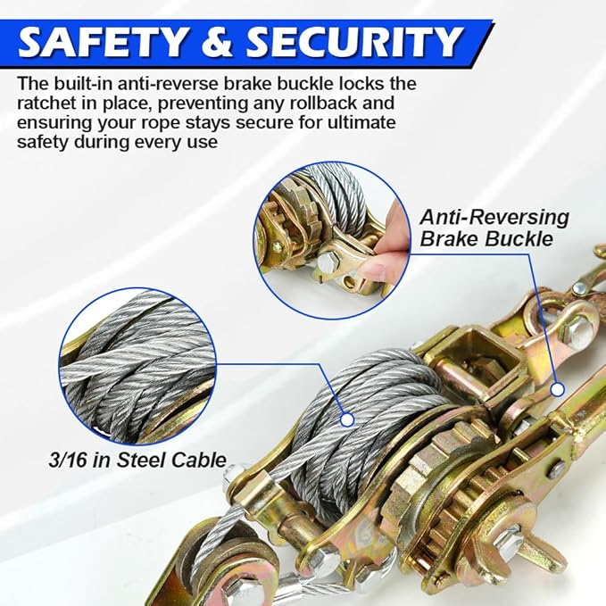 - Anti Reverse Braking Design: The cable winch puller gear has a reliable anti-reverse brake buckle that securely locks the ratchet in place. Comes with 2 alloy steel hooks with self-closing safety latches for secure connection, preventing accidents or slipping, and improving safety and stability during pulling movements