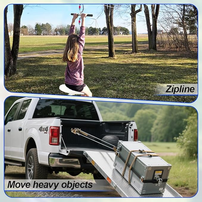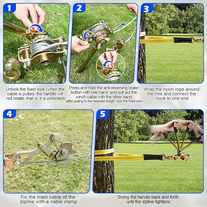 - Easy to install and use: Works on steel cables 3/16"-1/2" diameter. The steel cable puller is easy to install, comes with a tree sling for quick connection, and a detailed installation video is included on the detail page. If you have any questions about zipline tensioners, please feel free to contact us