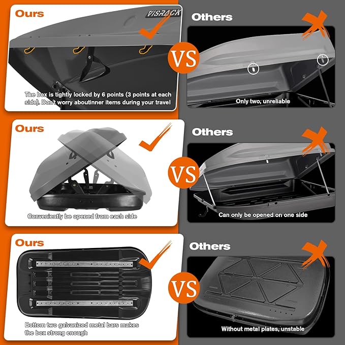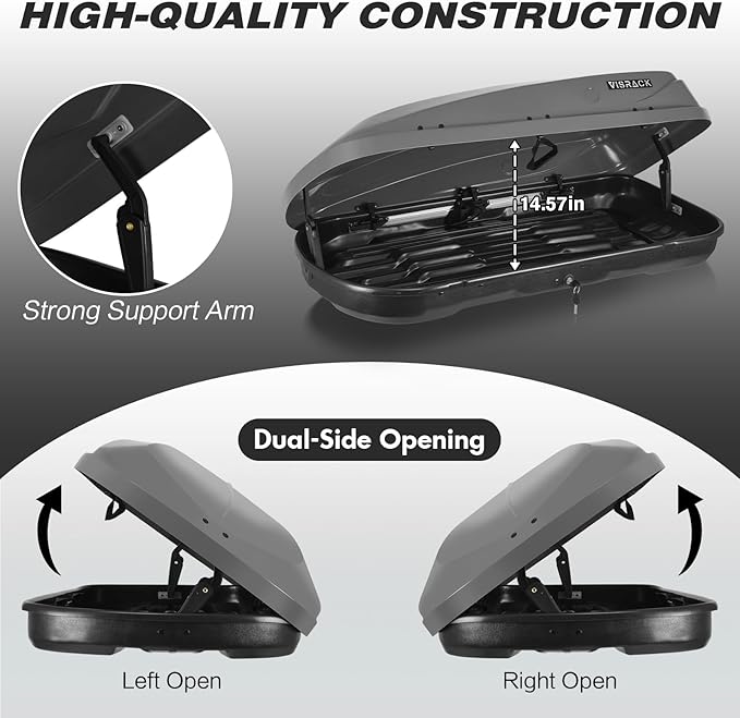 - Spacious & Practical Storage: Boasting 13 cubic feet of storage and a 130 lb capacity, this rooftop cargo box opens from the passenger side with a 13-inch wide entry. It’s ideal for bulky items and allows smooth loading and unloading from both sides.