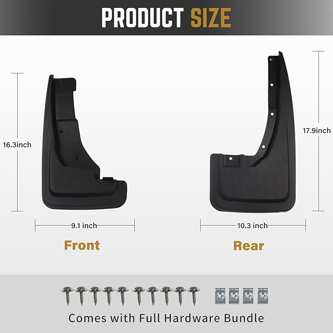 - 【Easy to install】 No Drilling Required, our mud guards have Pre-Drilled Mounting Holes match OEM Pattern; Each pack comes with all the mounting hardware you need along with easy to follow instructions included in each kit for a quick and easy installation.