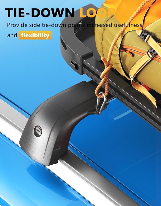 - 【Add Tie-down loops】Tie-down loops are added to each of the four brackets of the Tuyoung crossbar. Tie-down loops can play a huge role in securing items on your roof.