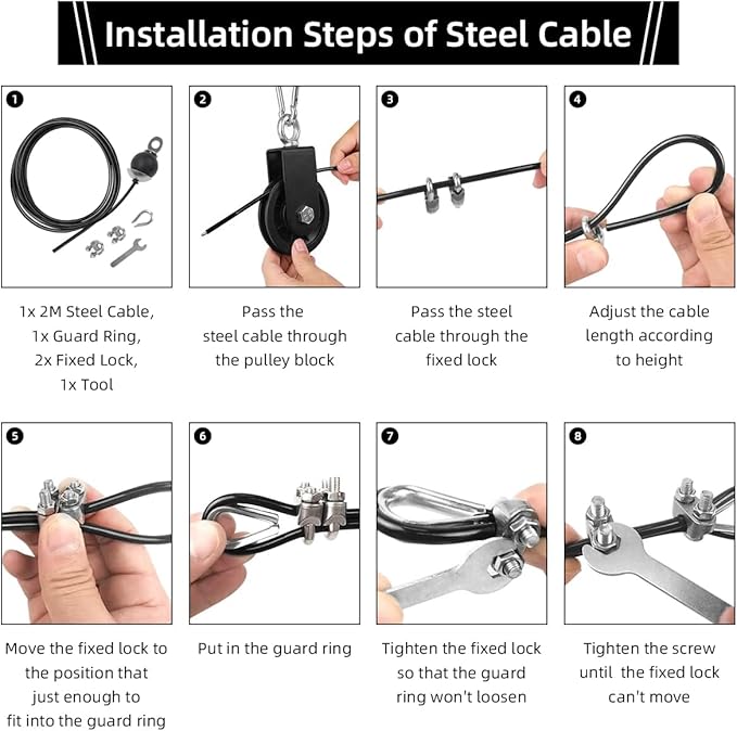 - Package Included: 1x upgrade loading pin, 1x swivel pulley, 1x nylon tricep rope, 1x 2M adjustable steel cable, 1x cable loop, 2x security buckles, 1x tool, 1x hanging strap, 3x carabiners, providing you to get the short, high-intensity workouts like those you do in the gym
