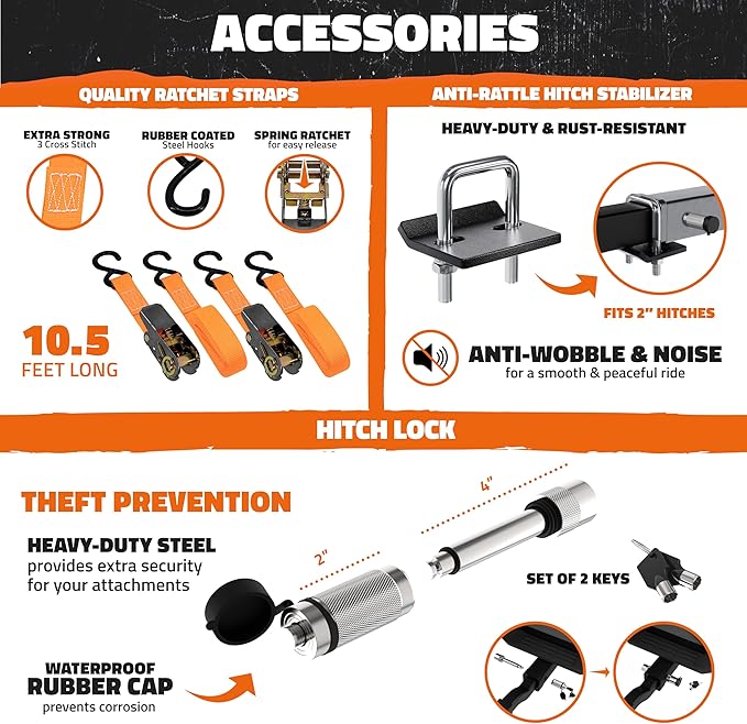 - COMPREHENSIVE CARGO CARRIER HITCH SETUP: Our heavy-duty deep trailer hitch storage rack includes a hitch lock & stabilizer for smoother, more secure travel—no bumper attachment required. The rear hitch cargo carrier set comes with long ratchet straps & a license plate bracket to keep your trailer hitch carrier road-ready. Whether it’s a weekend getaway or long-distance drive, the Mockins Square Folding Cargo Hitch Carrier allows you to load up more than the average receiver hitch cargo rack .