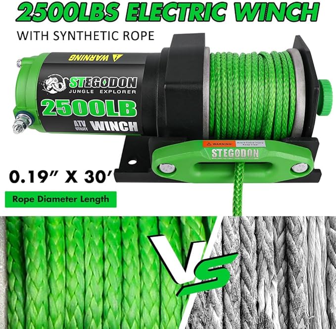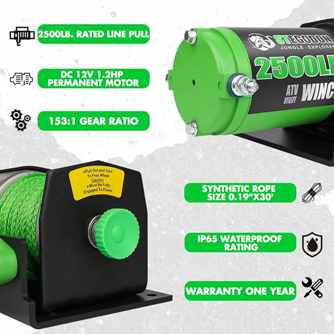 - High-efficiency: The STEGODON 2500 lbs line pull powered by a 0.9 kw/1.2 hp output permanent magnet DC 12V motor.The reliable dynamic brake prevent the rope from sliding while loading.Adopts an advanced combination planetary gear system with a gear ratio of 153:1,which ensures safe and reliable power supply in any situation