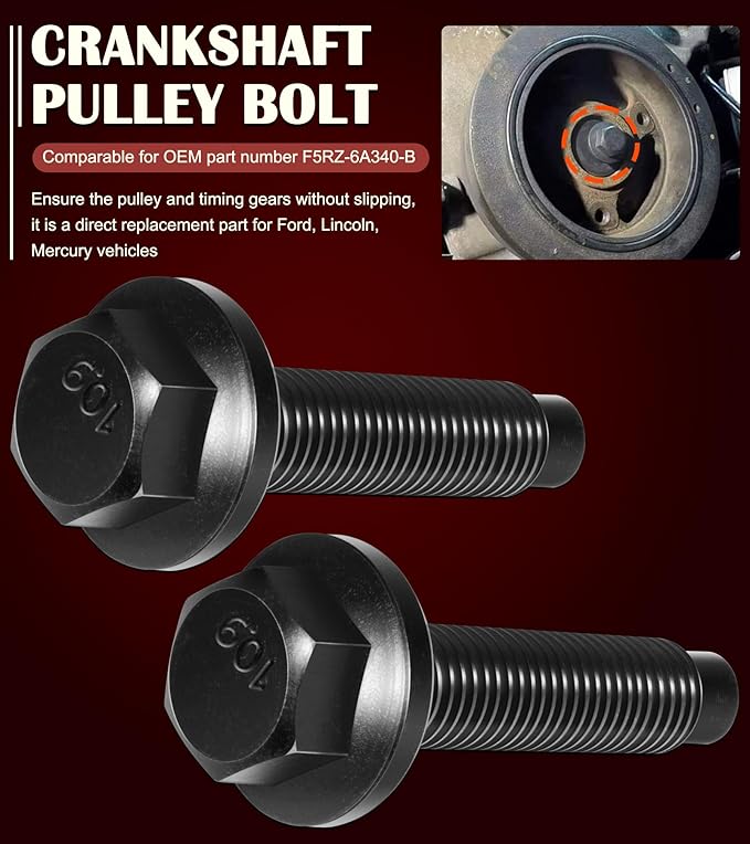 - 【Engine Crankshaft Pulley Bolt】Comparable to OEM part number F5RZ-6A340-B both in quality and functions, specially designed to firmly secure the pulley and timing gears without slipping, allows you safely and correctly replace the timing chain and phaser without breaking or rattling. Direct replacement part for Ford, Lincoln and Mercury vehicles, effectively upgrade and improve your engine performance.