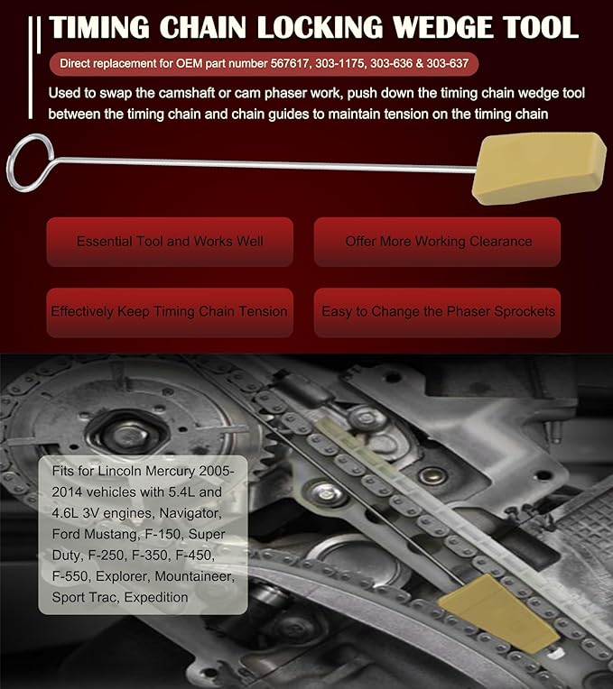 • 【Timing Chain Locking Tool】Used to swap the camshaft or cam phaser work without removing the front cover, push down the timing chain wedge tool between the timing chain and the chain guides to maintain the tension on the timing chain. Fits for Lincoln Mercury 2005-2014 vehicles with 5.4L and 4.6L 3V engines; for Navigator, for Ford Mustang, for F-150, for Super Duty, for F-250, for F-350, for F-450, for F-550, for Explorer, for Mountaineer, for Sport Trac, for Expedition.