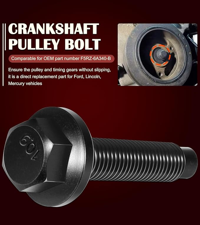 • 【Engine Crankshaft Pulley Bolt】Comparable to OEM part number F5RZ-6A340-B both in quality and functions, specially designed to firmly secure the pulley and timing gears without slipping, allows you safely and correctly replace the timing chain and phaser without breaking or rattling. Direct replacement part for Ford, Lincoln and Mercury vehicles, effectively upgrade and improve your engine performance.