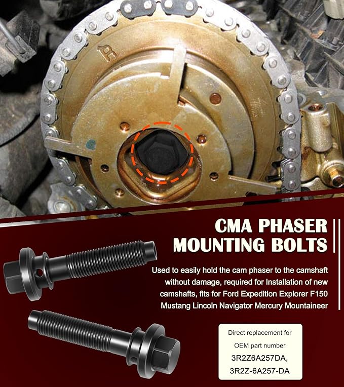 • 【Camshaft Timing Cam Phaser Mounting Bolts】Direct replacement for OEM part number 3R2Z6A257DA and 3R2Z-6A257-DA both in quality and functions. Designed to easily install and hold the cam phasers to the camshaft without damage, must-have for Installation of new camshafts, match the original factory specifications for a perfect secure fit. Perfect for Ford Expedition Explorer F150 Mustang Lincoln Navigator Mercury Mountaineer.