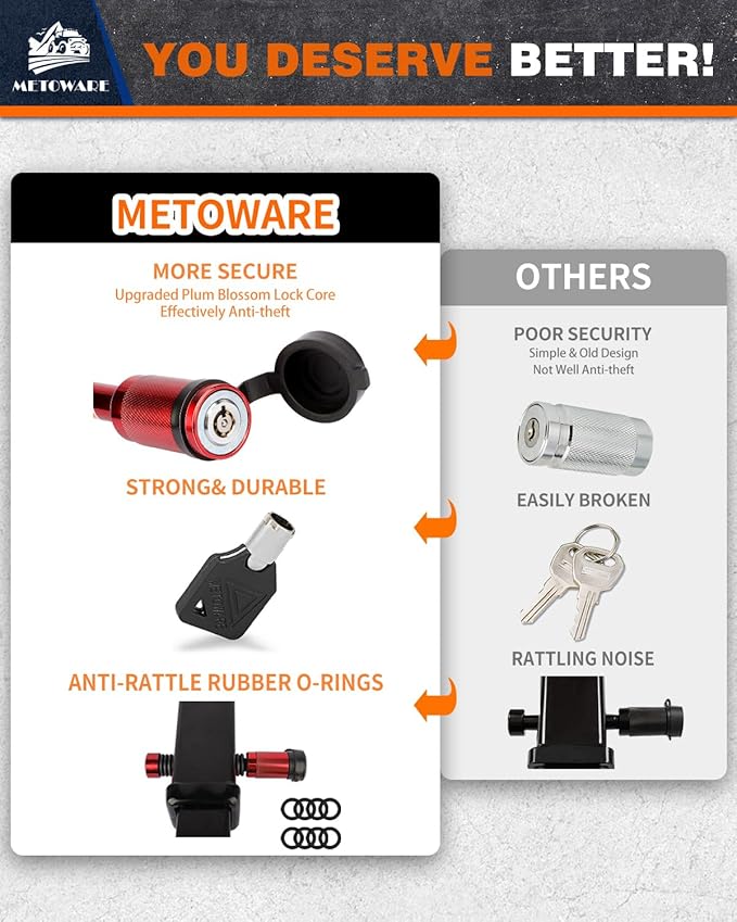 - VIBRATION AND NOISE REDUCTION: The hitch lock includes 8 rubber O-rings for shock absorption and noise reduction, providing a smoother and quieter towing experience.