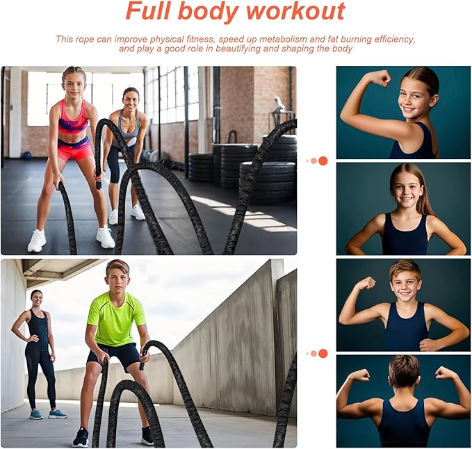 - 【Anti-slip Handles Battle Ropes】The workout rope's heat-shrink handles not only improve grip strength but also offer a comfortable exercise experience, whether you're at home or in the gym. Even when your palms get sweaty during intense exercises, they firmly prevent slipping. It's the best workout rope, battle ropes for home gym to exercise your hands, arms, shoulders, back, core, and even legs for a full-body exercise. It's also a workout rope that can help improve your comprehensive strength