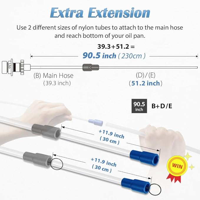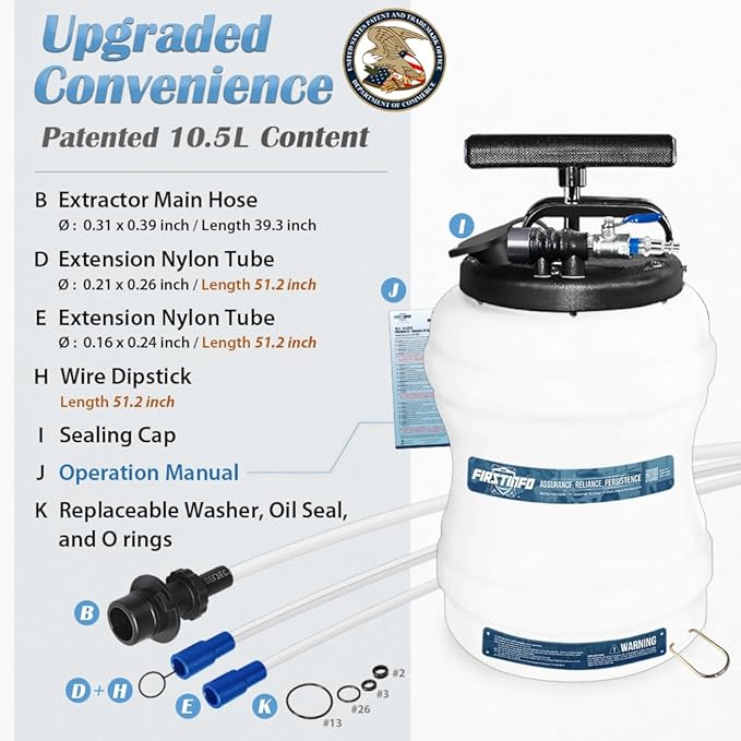 - 【Extract Every Drop – No Oil Left Behind】 Equipped with two upgraded, extra-long suction tubes of different diameters, allowing you to reach deep into the reservoir and remove oil completely. Say goodbye to stubborn sludge and leftover fluid.