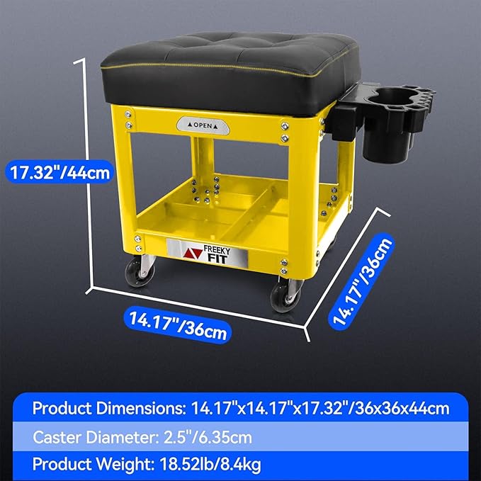 - 【2 Large Tool Tray Storages】The garage stool has TWO storage spaces, one under the seat and the other one is the obvious three-compartment chassis. About the large tool tray storage under the seat, you just need to lift the cushion to access and retrieve your tools at your fingertips. Its good sealing keeps a better preservation of your tools. About the three-compartment chassis, you can take your tools at will