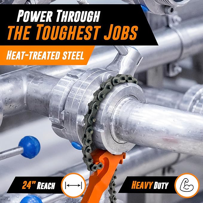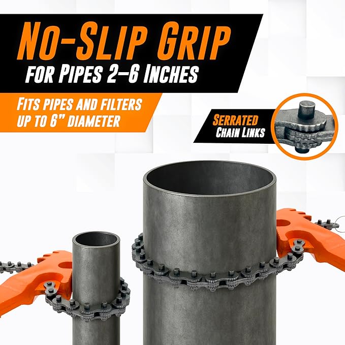 - PROFESSIONAL STRENGTH DESIGN: Heat-treated carbon steel chain wrench built to handle extreme torque demands. Serrated chain teeth provide a secure, no-slip grip on pipes and filters.