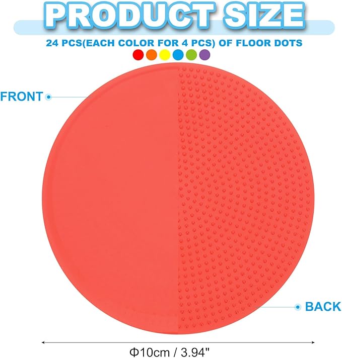 - Material: TPE; Color: Purple/Red/Green/Blue/Orange/Yellow; Diameter: 10cm / 3.94inch; Packing List: 24pcs of floor dots, 1 pcs of storage bag