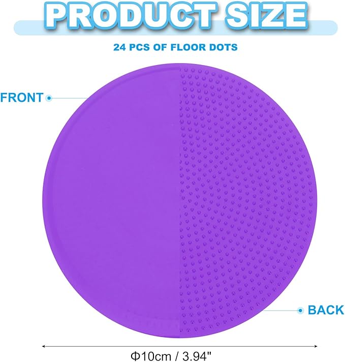 - Material: TPE; Color: Purple; Diameter: 10cm / 3.94inch; Packing List: 24pcs of floor dots, 1 pcs of storage bag