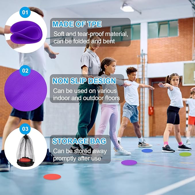 - Application: These poly spot markers are often used in homes, classrooms, playgrounds, and dance studios. They are convenient training accessories for agility training, sports training, fixed-point sitting, color tracking, classroom games, dance, sports, etc