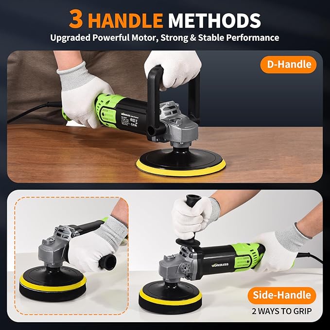 - 【Versatile 3 Handle Modes】There are three ergonomic handles to choose from: side handles that can be fixed on either side, U-shaped handles for easy movement, or go handle-free. Switching between grips is designed for comfort and control, selecting a grip that adapts to your preference for precise, comfortable polishing.