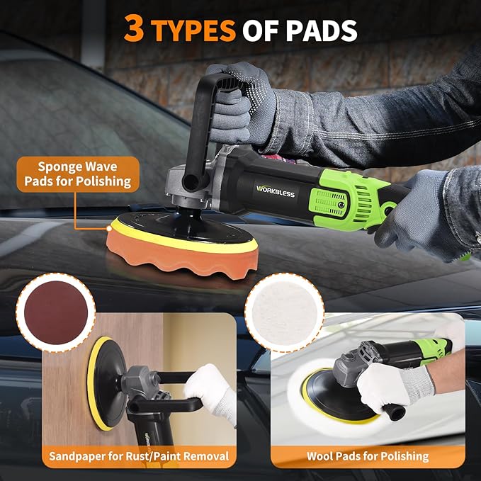 - 【Multi-Purpose Pad Kit】Includes 3 pads: soft wool pads for gentle polishing, durable sponge pads for multi-purpose use, and hard sandpaper pads for heavy grime removal. This car polisher kit is perfect for cars, furniture, stone, and more for everyday polishing and cleaning needs.