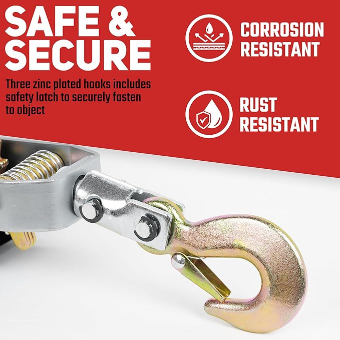 - WINCH HOOK: Heavy duty puller steel construction for added durability; hooks and gears are zinc plated for a long-lasting life in your garage or workshop when pulling, dragging, lifting, or stretching. Safety latch on all hooks to prevent accidents or slipping off.