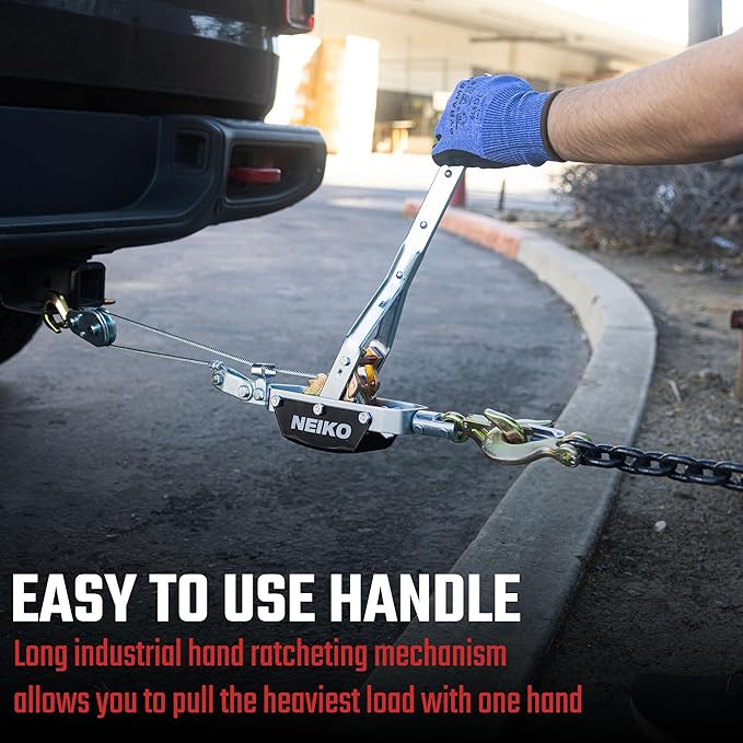 - LEVER ARM: Includes long industrial hand ratchet handle with PVC coated grip for leverage and 2 latching hooks for added safety and versatility when going off road vehicle recovery, pulling fences, logs, stumps, or rocks.
