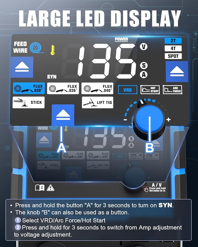 - 【LARGE CLEAR LED DISPLAY】: The mig welder features an upgraded oversized LED screen with a clean layout for crystal-clear visibility and intuitive operation, making setting adjustments faster and easier than ever.
