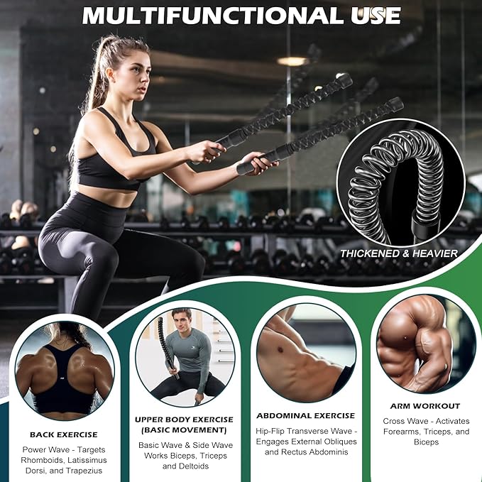 - Easy to Use: Our heavy rope requires no installation, so you can exercise anywhere, anytime, without the complicated installation and fixing of traditional battle ropes. It has more than 13 dynamic exercise options targeting arms, chest, back and legs, providing comprehensive HIIT, strength and endurance benefits.