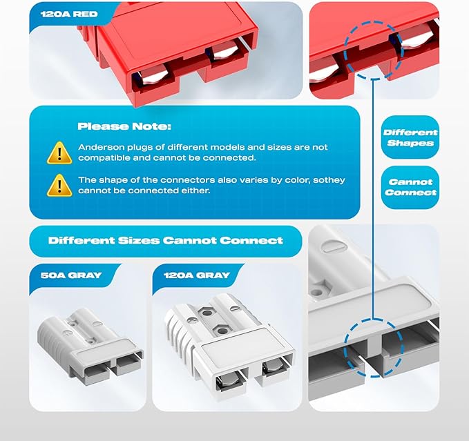 - Please Note: You are viewing the 120A gray Anderson connector, which cannot connect with red connectors or with 50A, 175A, or 350A connectors. Please carefully compare the color and size to avoid any inconvenience caused by incorrect purchases