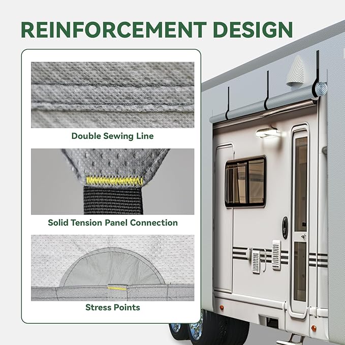 - WIND PROTECTION: Designed with reinforced straps, and high-quality, wind-resistant materials to ensure a secure and tight fit. These features help protect your RV from strong gusts and prevent the cover from lifting or tearing, giving you peace of mind even during stormy conditions.