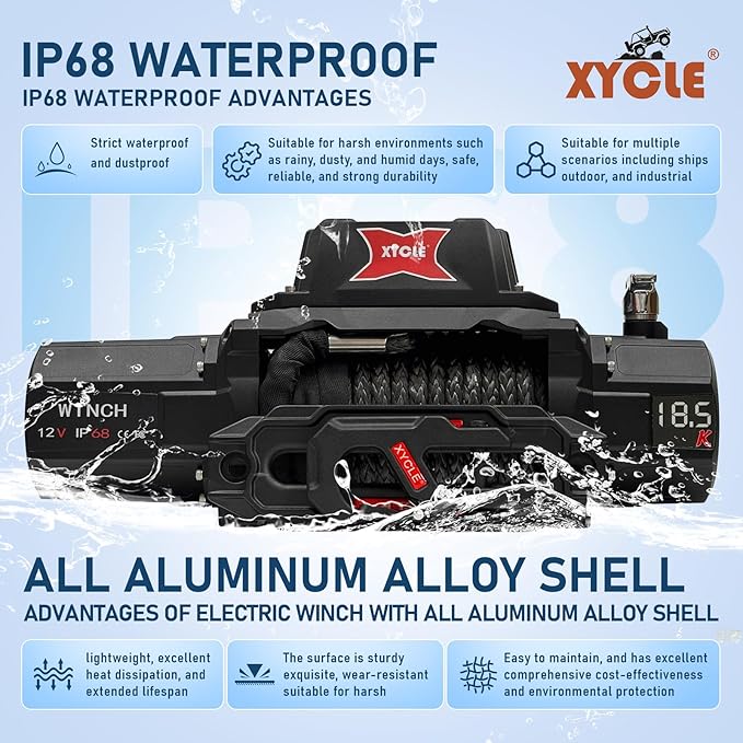 - 【 New design and precision manufacturing process 】 XYCLE unique appearance design provides IP68 waterproof, dustproof, and moisture-proof traction winch. The overall winch adopts aviation grade aluminum alloy precision die-casting, which is lightweight and has good heat dissipation performance that ordinary winches cannot possess. The 3-level planetary gears and gear rings are all made of precision cold extruded high-strength alloy steel, with a gear ratio of 280:1 and stable and strong power output. The motor uses all purple copper coils to ensure super strong power output and durability of the motor