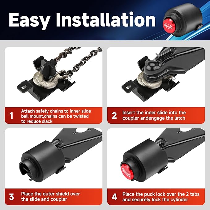 - Anti-Theft Protection: Equipped with a high-security brass core, trailer lock offers strong resistance against prying, drilling, and lock-picking tools. It’s built to stop thieves in their tracks and keep your trailer, RV, and valuables safe