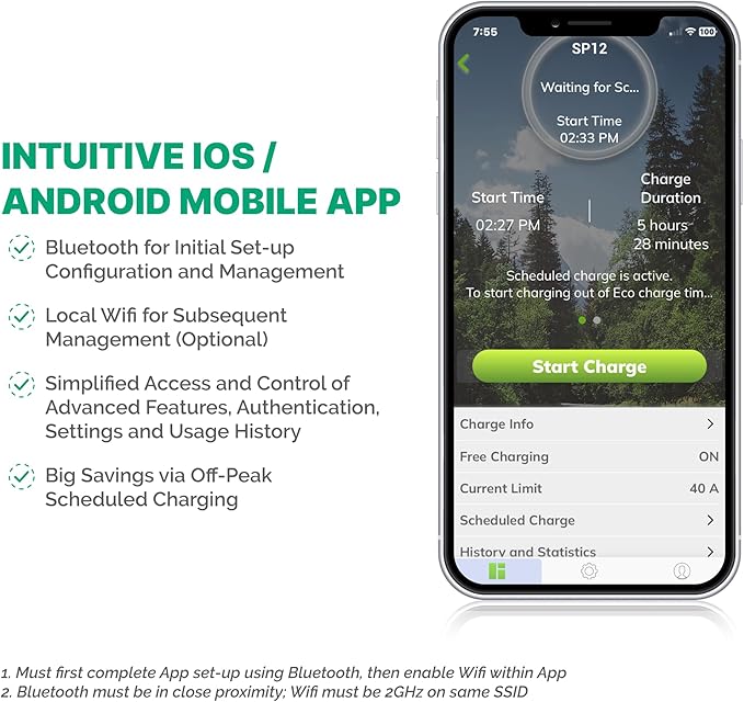 - ADJUSTABLE POWER (8A–50A) & SCHEDULED CHARGING – Take full control of your energy use and savings. Customize your charging speed to match your home’s capacity, from 8A to 50A, and schedule charging sessions during off-peak utility hours to reduce your electric bill. Enjoy the convenience of waking up to a fully charged vehicle without paying peak rates.