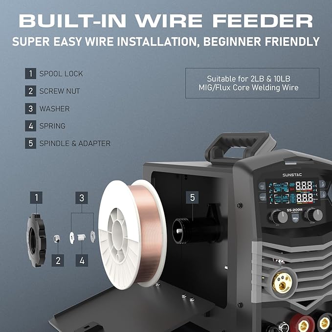 - 【Intelligent Synergic Control】Sunstac 200A MIG welder possesses IGBT and integrated wire feeding technology, which is tailored for whom that looks for a simple and user-friendly MIG welding machine. With its intelligent synergic mode, the wire feeding speed and voltage will be automatically adjusted by regulating the current