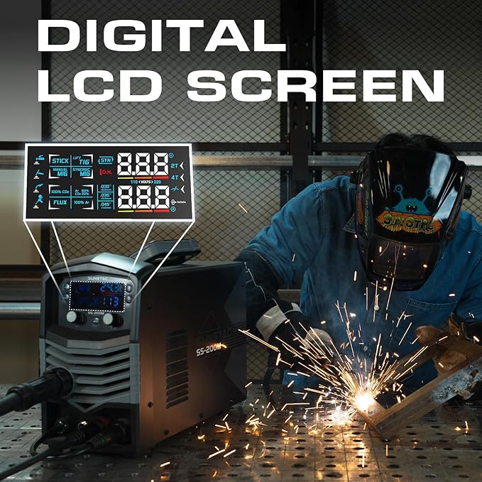 - 【5 IN 1 SMART WELDER】The SS-200M MIG welder offers 5 welding options: MIG, Gasless MIG, Spool Gun MIG (Spool Gun NOT included in pack), Stick, Lift TIG (TIG Torch NOT included in pack). Maximum current is 200Amps, supporting .030" (0.8mm), .035" (0.9mm) and .040 (1.2mm) mig wires. The MIG/Flux Core welder is capable for welding stainless steel, carbon steel, Aluminum and even thicker steel. Ideal for home maintainence, yard repairs, farm and road equipment fixing