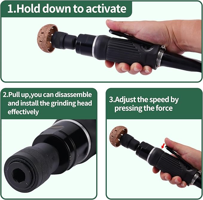 - Package Includes:1 x Grinder, 1 x Air Pipe, 2 x Air Intake Connector, 3 x Replacement Tungsten Steel Grinding Heads, 3 x Precision Chucks, 1 x Tire Roller, 1 x Tire Inner Liner Scrapper.