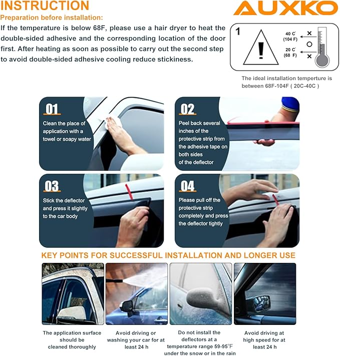 - AUXKO-Sales Service - The package includes 4pcs rain deflectors and 1 adhesion promoter. If you have any questions or concerns about the product, don’t hesitate to reach out to us. We’re committed to providing you with a satisfactory solution.
