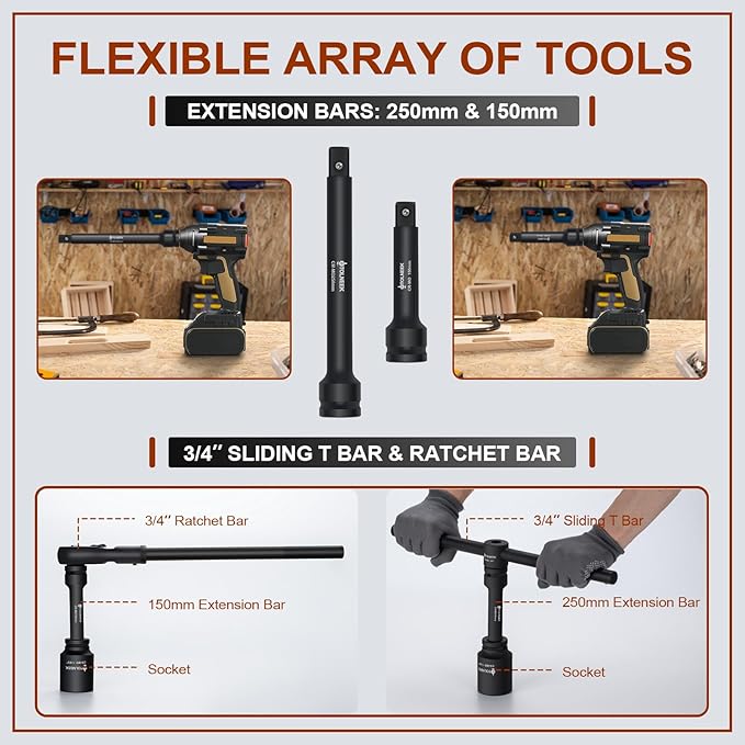- 【3/4" Impact Socket Set】Tolneek 3/4" Drive Impact Socket Set Includes 22 sockets, Metric: 19mm, 21mm, 22mm, 24mm, 26mm, 27mm, 29mm, 29mm, 30mm, 32mm, 33mm, 34mm, 35mm, 36mm, 38mm, 41mm, 46mm, 50mm Quick Release Ratchet Handle 18''(24 Tooth), 1PC 3/4'' Sliding T Head Breaker Bar 18'' ,2 Pcs Extension Bar (6'',10''),1 x Storage Case