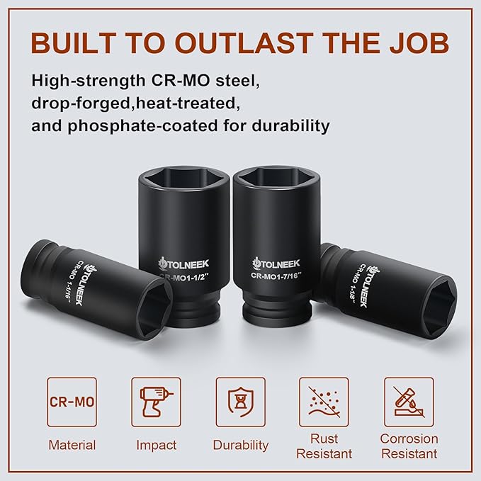 - 【Durable Construction & Corrosion Resistance】Made from Cr-Mo steel, each socket is heat-treated to withstand high torque for long-lasting performance. The black phosphate finish provides superior protection against corrosion, oil, and dirt, ensuring durability in harsh environments.